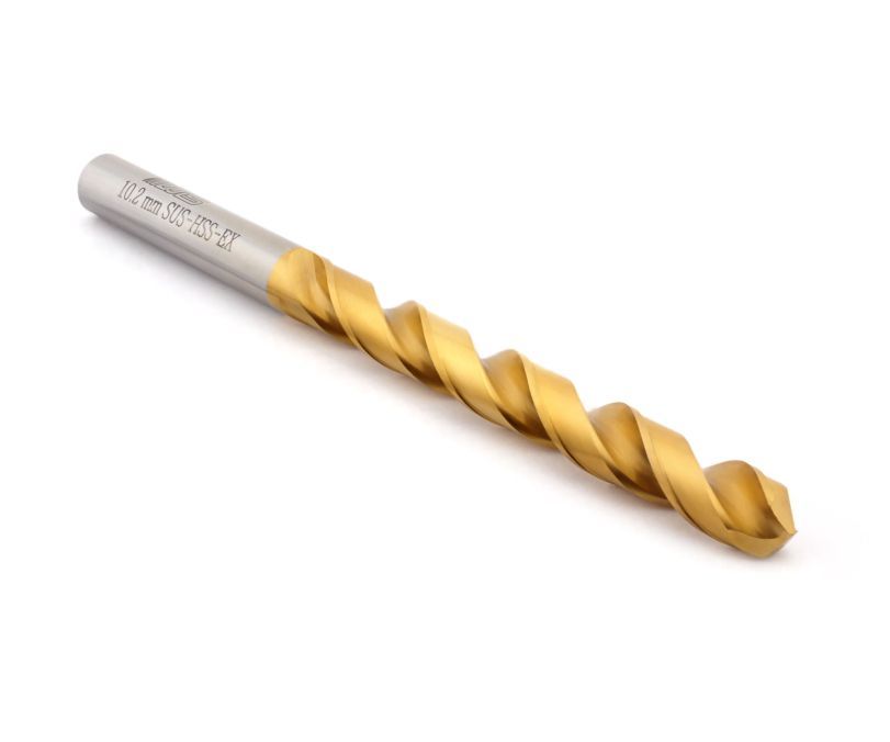 Спиральное сверло по металлу диаметром 10 мм, угол при вершине режущей кромки 135°, общая длина сверла 133 мм, длина режущейчасти 87 мм. Сверло изготовлено из быстрорежущей стали SUS HSS-EX (содержание Кобальта 6%) и предназначено для сверления отверстий в изделиях из нержавеющих и жаропрочных сталей. Для увеличения износостойкости сверла применено покрытие из Нитрида Титана (TiN).