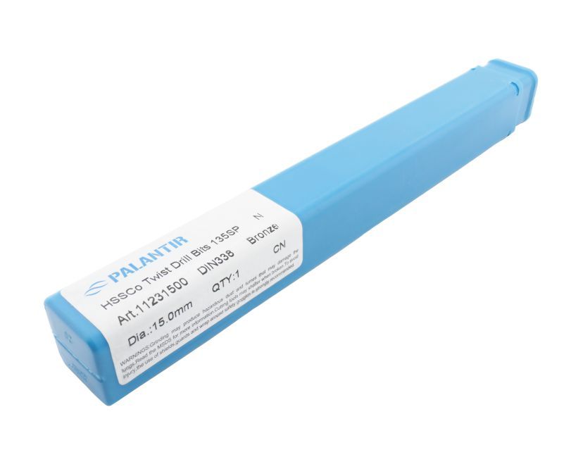 Спиральное сверло 15,0-HSCo-5 (DIN338) по металлу типа N диаметром 15 мм, угол при вершине режущей кромки 135°, общая длина сверла 169 мм. Сверло изготовлено из быстрорежущей стали M35 (содержание кобальта 5%) и используется для сверления отверстий в изделиях из нержавеющих и жаропрочных сталей. Бронзовое покрытие защищает инструмент от коррозионного воздействия и обеспечивает его износостойкостью.
