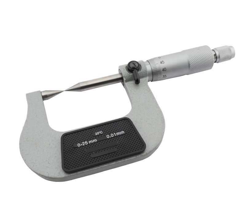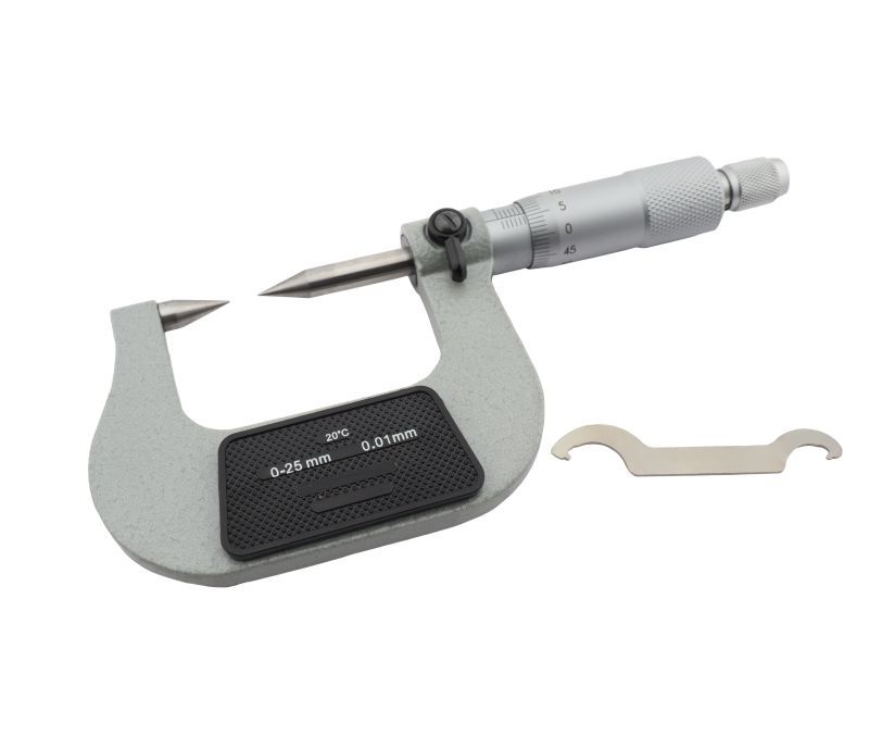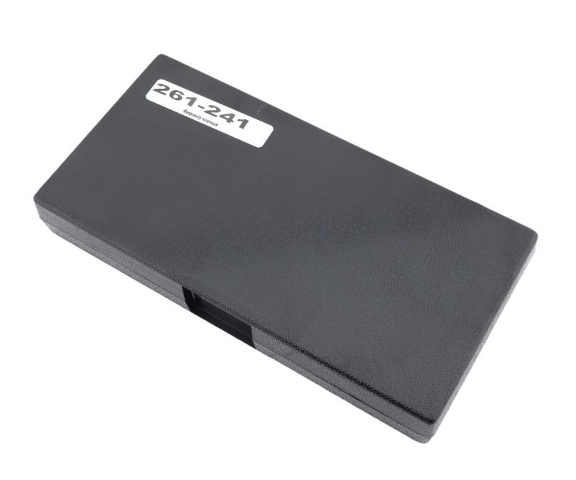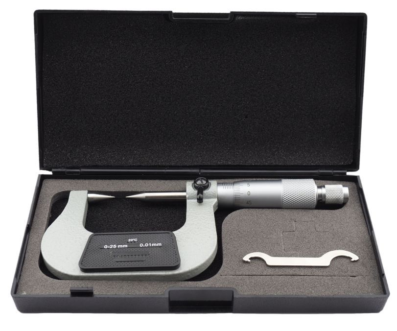 Микрометр точечный 261-241 диапазон измерения 0-25 мм, шаг измерения 0.01 мм, с точностью 0.004 мм. Заострённый шпиндель и наковальня для измерения толщины сверл небольших канавок, шпоночных пазов и других труднодоступных мест; шпиндель изготовленой из специальной стали для обеспечения высокой точности и стабильности, а так же встроенное устройство ограничения усилия.