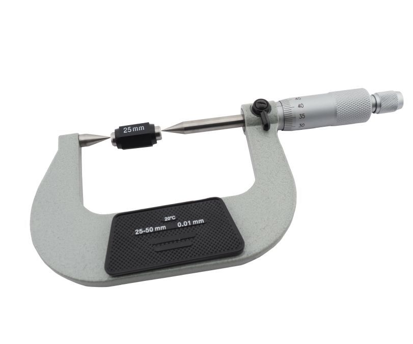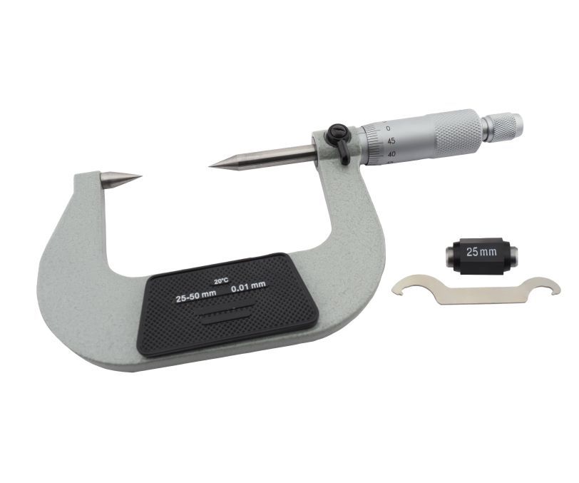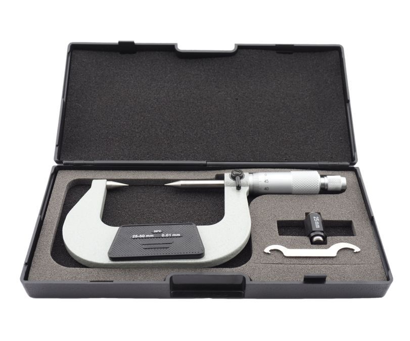 Микрометр точечный 261-242 диапазон измерения 25-50 мм, шаг измерения 0.01 мм, с точностью 0.004 мм. Заострённый шпиндель и наковальня для измерения толщины сверл небольших канавок, шпоночных пазов и других труднодоступных мест; шпиндель изготовленой из специальной стали для обеспечения высокой точности и стабильности, а так же встроенное устройство ограничения усилия.
