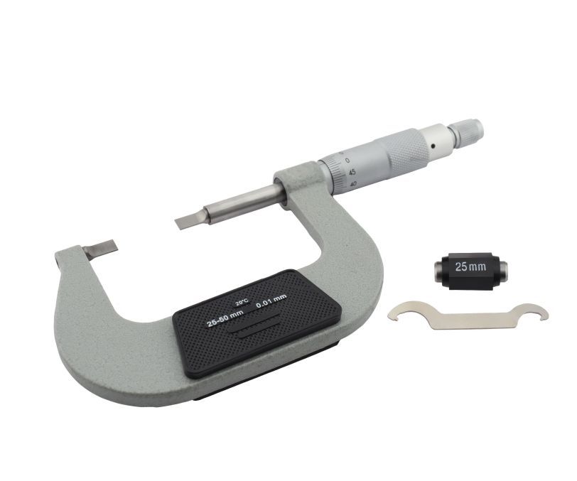 Микрометр лезвийный 262-302 для измерения диаметра канавок с диапазоном 25-50 мм, шагом 0,01 и точностью 0,004 мм.Так же имеет высокоточный прямой винт; с усилием храповой втулки; две дополнительные плоские измерительные поверхности.