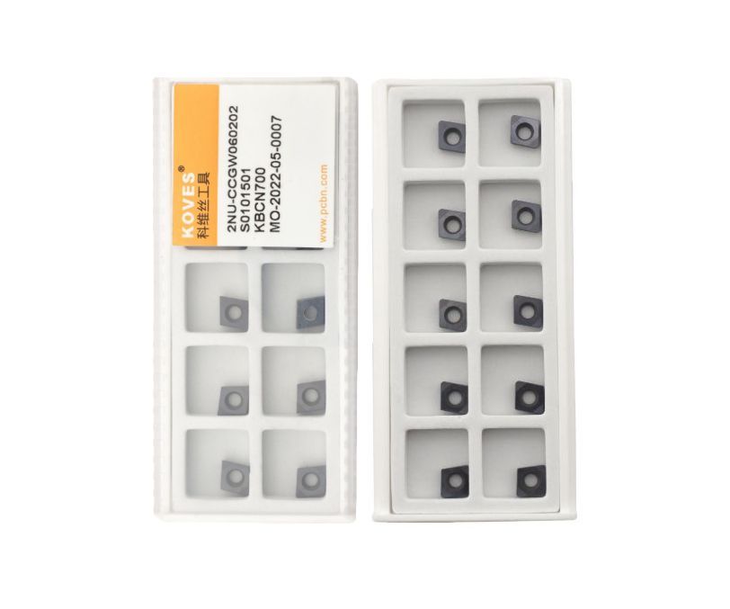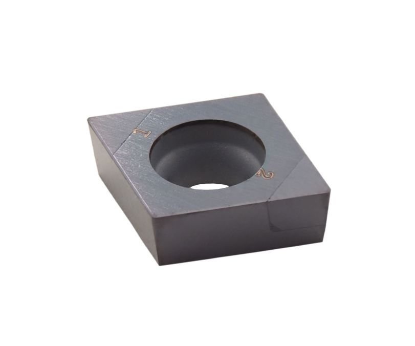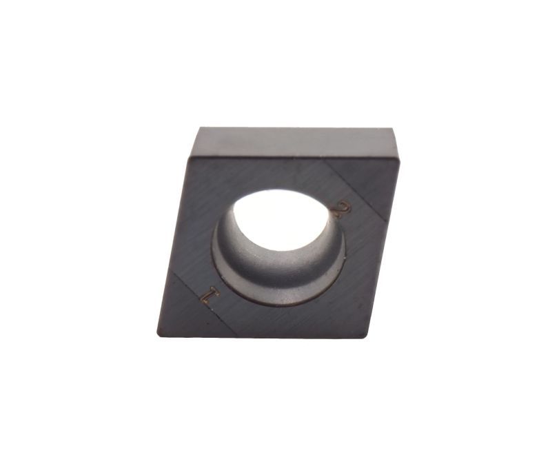 Сменная пластина 2NU-CCGW060202-KBCN700 используется для токарной чистовой обработки чугуна. Конструктивно представляет собой основу из твердого сплава, на одной стороне которой установлены две напайки из сверхтвердого материала PCBN без защитного покрытия. Форма пластины - C (ромб 80°). Позитивная геометрия, задний угол C (7°). Радиус при вершине 0,2 мм.