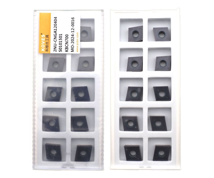 Сменная пластина 2NU-CNGA120404-KBCN700 используется для токарной получистовой обработки закаленной стали. Конструктивно представляет собой основу из твердого сплава, на одной стороне которой установлены две напайки из сверхтвердого материала PCBN с защитным покрытием. Форма пластины - C (ромб 80°). Негативная геометрия, задний угол N (0°). Радиус при вершине 0,4 мм.