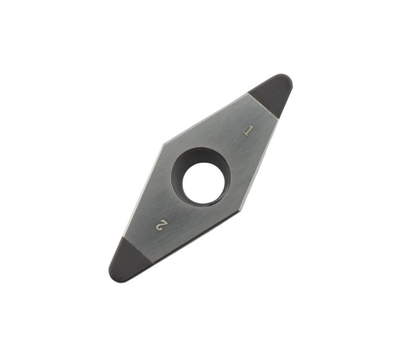 Сменная пластина 2NU-VBGW110308-KBN910 используется для токарной получистовой обработки чугуна. Конструктивно представляет собой основу из твердого сплава, на одной стороне которой установлены две напайки из сверхтвердого материала PCBN без защитного покрытия. Форма пластины - V (ромб 35°). Позитивная геометрия, задний угол B (5°). Радиус при вершине 0,8 мм.