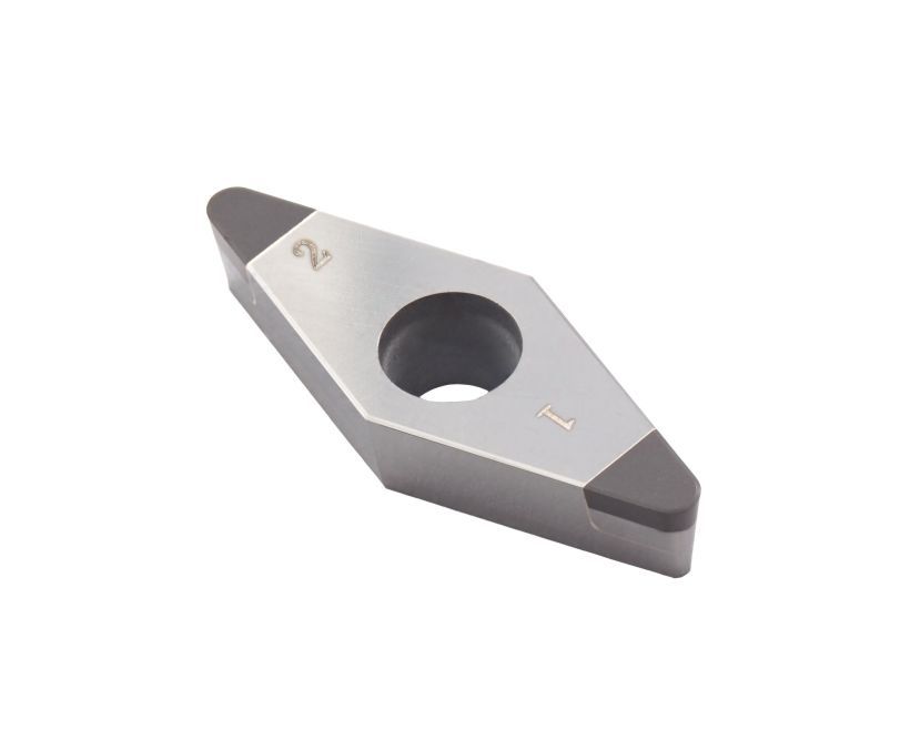 Сменная пластина 2NU-VCGW110308-KBN910 используется для токарной получистовой обработки чугуна. Конструктивно представляет собой основу из твердого сплава, на одной стороне которой установлены две напайки из сверхтвердого материала PCBN без защитного покрытия. Форма пластины - V (ромб 35°). Позитивная геометрия, задний угол C (7°). Радиус при вершине 0,8 мм.
