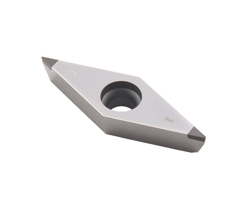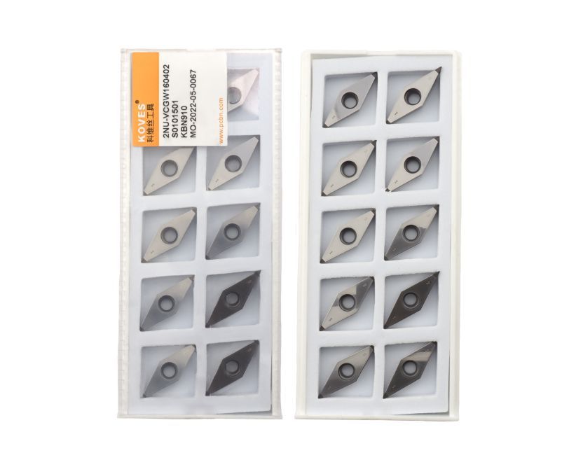 Сменная пластина 2NU-VCGW160402-KBN910 используется для токарной чистовой обработки чугуна. Конструктивно представляет собой основу из твердого сплава, на одной стороне которой установлены две напайки из сверхтвердого материала PCBN без защитного покрытия. Форма пластины - V (ромб 35°). Позитивная геометрия, задний угол C (7°). Радиус при вершине 0,2 мм.