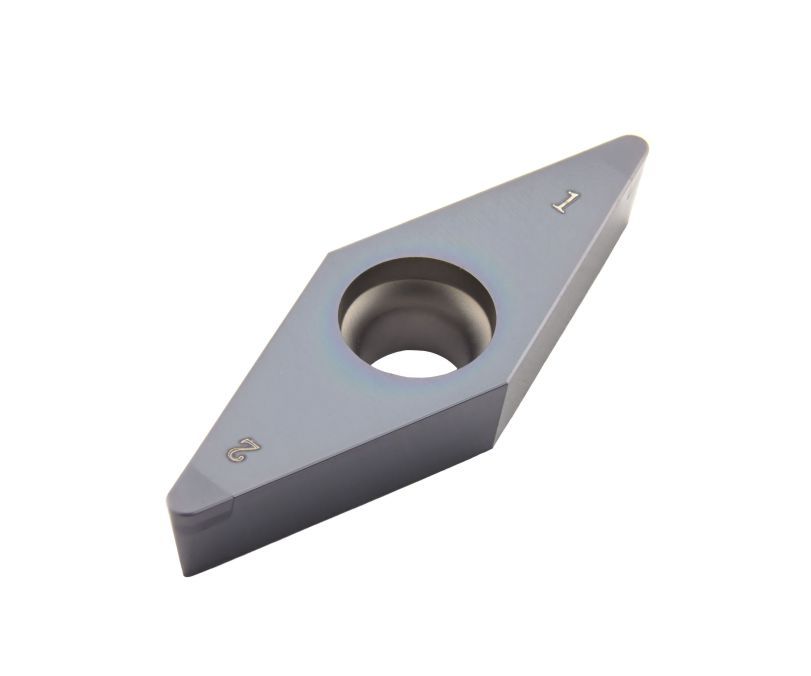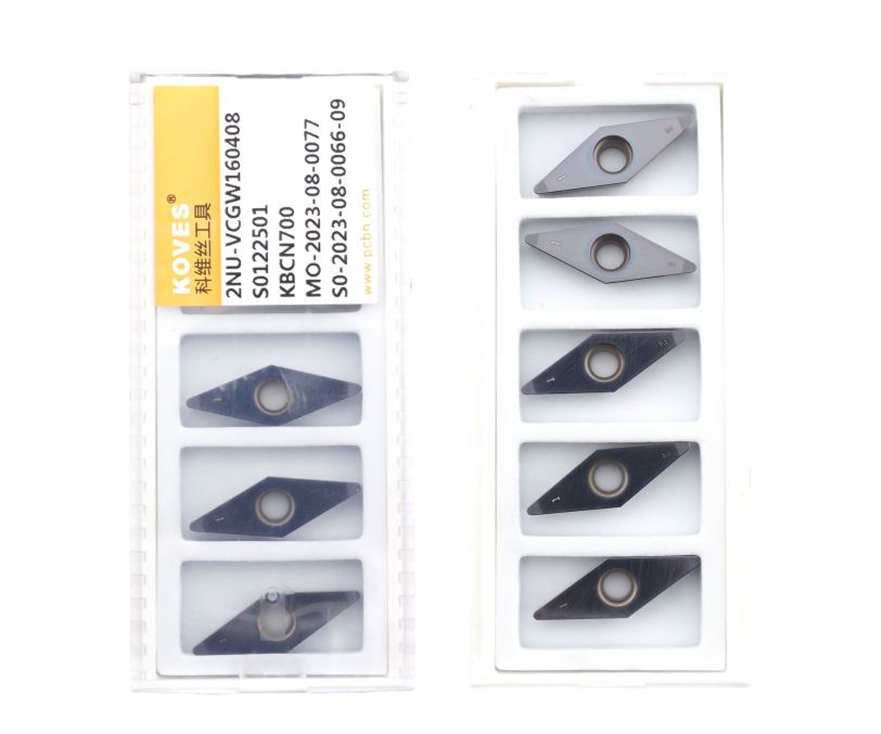 Сменная пластина 2NU-VCGW160408-KBCN700 используется для токарной получистовой обработки закаленной стали. Конструктивно представляет собой основу из твердого сплава, на одной стороне которой установлены две напайки из сверхтвердого материала PCBN с защитным покрытием. Форма пластины - V (ромб 35°). Позитивная геометрия, задний угол C (7°). Радиус при вершине 0,8 мм.