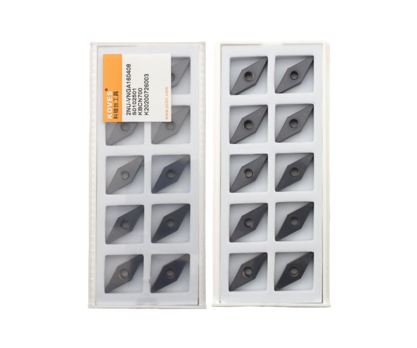 Сменная пластина 2NU-VNGA160408-KBCN700 используется для токарной получистовой обработки закаленной стали. Конструктивно представляет собой основу из твердого сплава, на одной стороне которой установлены две напайки из сверхтвердого материала PCBN с защитным покрытием. Форма пластины - V (ромб 35°). Негативная геометрия, задний угол N (0°). Радиус при вершине 0,8 мм.
