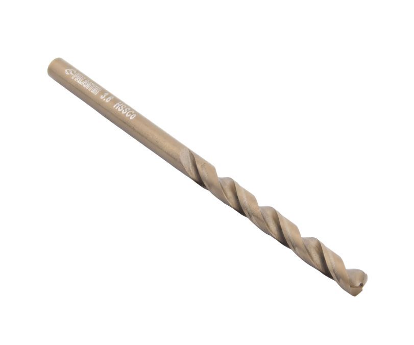 Спиральное сверло 3,6-HSCo-5 (DIN338) по металлу типа N диаметром 3,6 мм, угол при вершине режущей кромки 135°, общая длина сверла 70 мм. Сверло изготовлено из быстрорежущей стали M35 (содержание кобальта 5%) и используется для сверления отверстий в изделиях из нержавеющих и жаропрочных сталей. Бронзовое покрытие защищает инструмент от коррозионного воздействия и обеспечивает его износостойкостью.