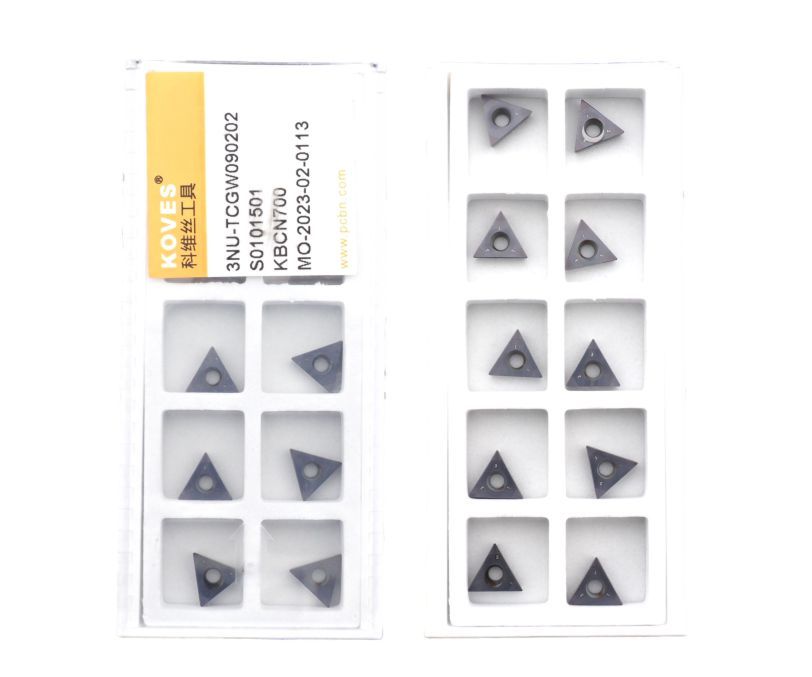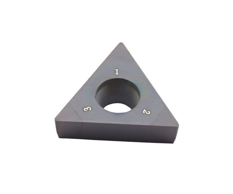 Сменная пластина 3NU-TCGW090202-KBCN700 используется для токарной чистовой обработки чугуна. Конструктивно представляет собой основу из твердого сплава, на одной стороне которой установлены три напайки из сверхтвердого материала PCBN без защитного покрытия. Форма пластины - T (треугольник 60°). Позитивная геометрия, задний угол C (7°). Радиус при вершине 0,2 мм.