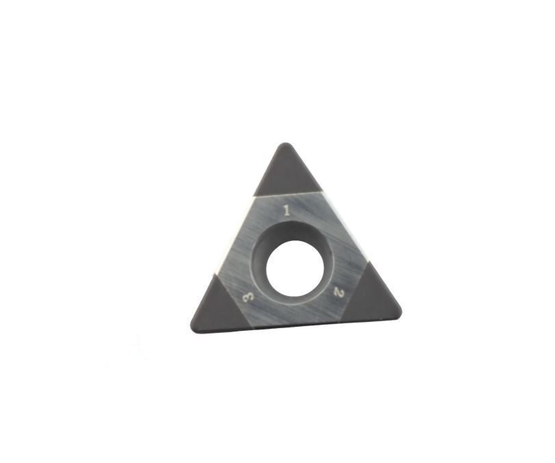 Сменная пластина 3NU-TCGW090204-KBN910 используется для токарной получистовой обработки чугуна. Конструктивно представляет собой основу из твердого сплава, на одной стороне которой установлены три напайки из сверхтвердого материала PCBN без защитного покрытия. Форма пластины - T (треугольник 60°). Позитивная геометрия, задний угол C (7°). Радиус при вершине 0,4 мм.