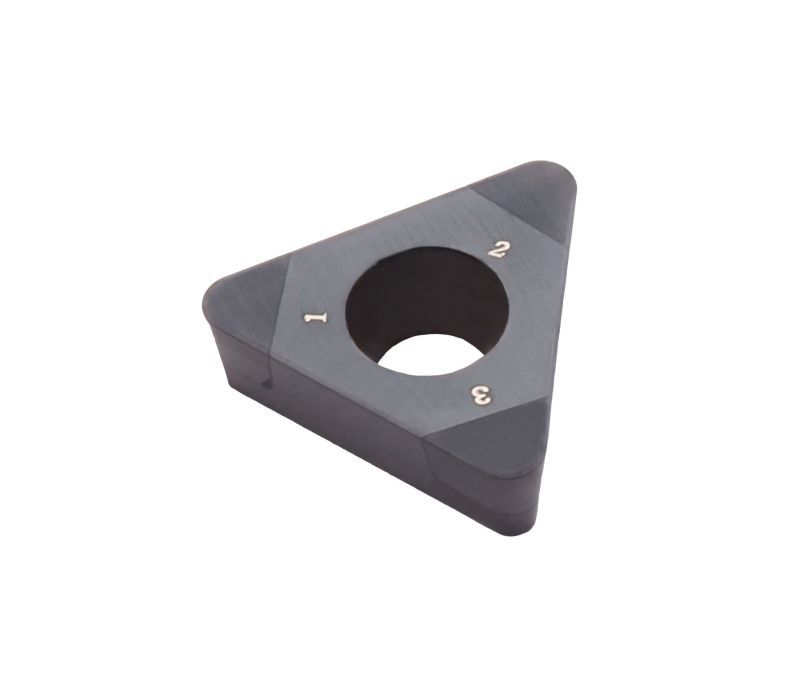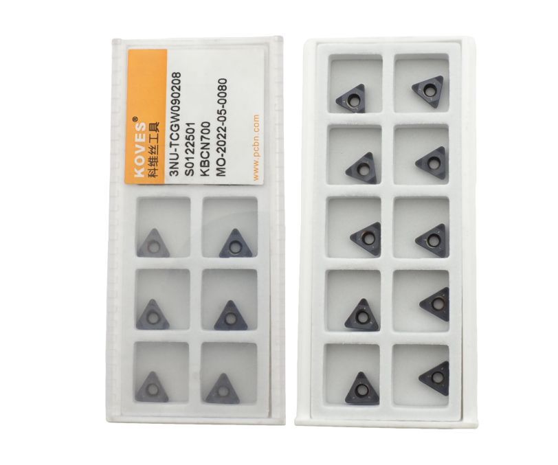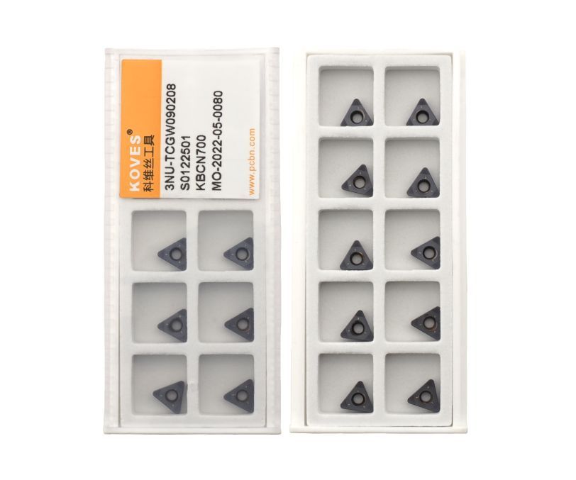 Сменная пластина 3NU-TCGW090208-KBCN700 используется для токарной получистовой обработки закаленной стали. Конструктивно представляет собой основу из твердого сплава, на одной стороне которой установлены три напайки из сверхтвердого материала PCBN с защитным покрытием. Форма пластины - T (треугольник 60°). Позитивная геометрия, задний угол C (7°). Радиус при вершине 0,8 мм.