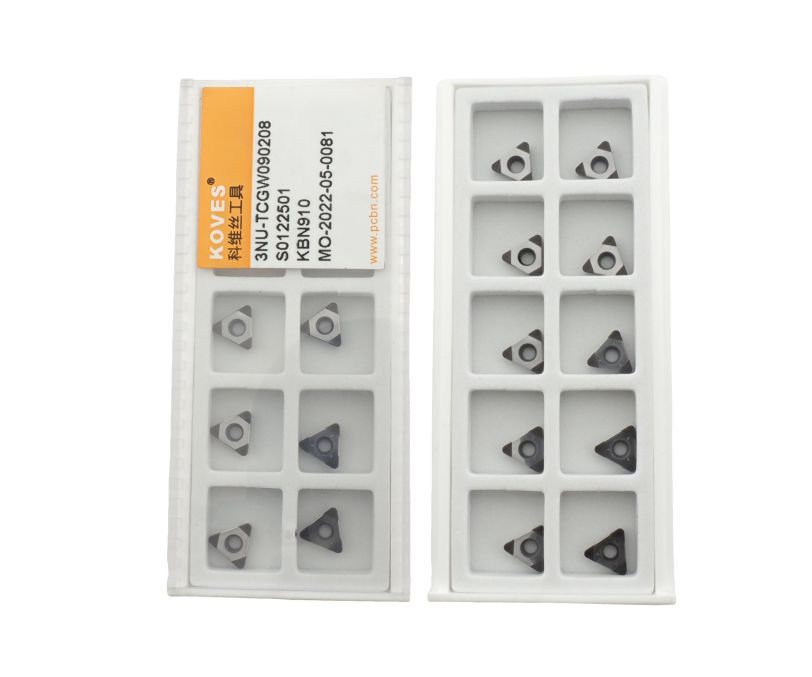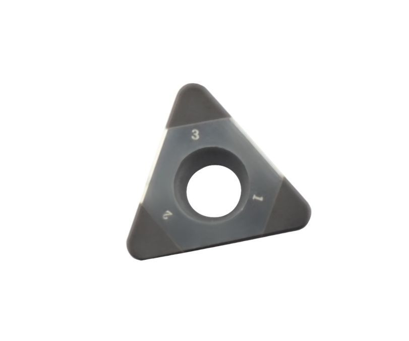 Сменная пластина 3NU-TCGW090208-KBN910 используется для токарной получистовой обработки чугуна. Конструктивно представляет собой основу из твердого сплава, на одной стороне которой установлены три напайки из сверхтвердого материала PCBN без защитного покрытия. Форма пластины - T (треугольник 60°). Позитивная геометрия, задний угол C (7°). Радиус при вершине 0,8 мм.
