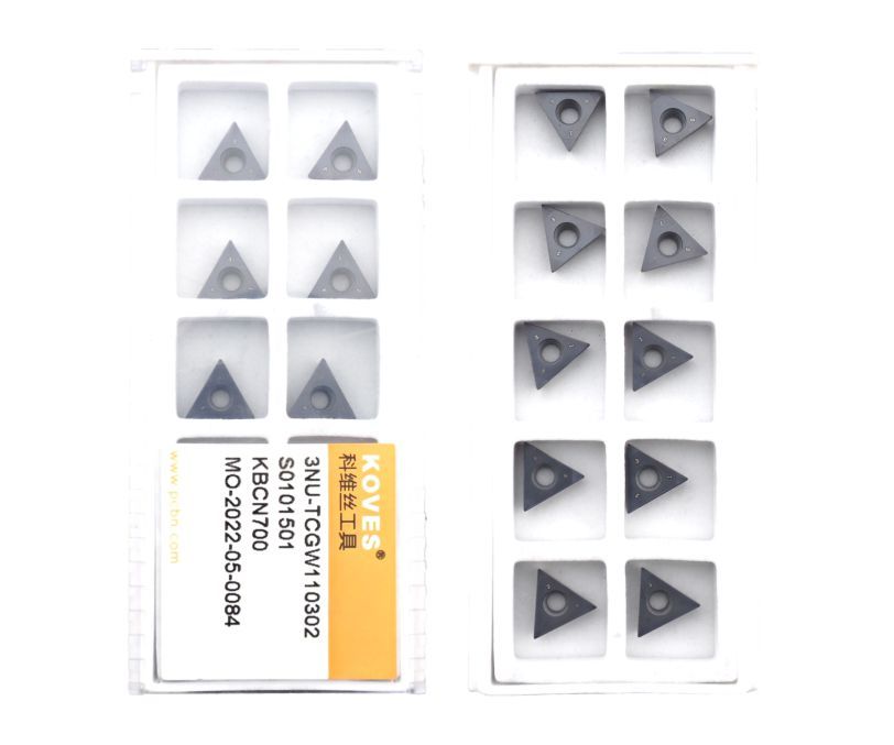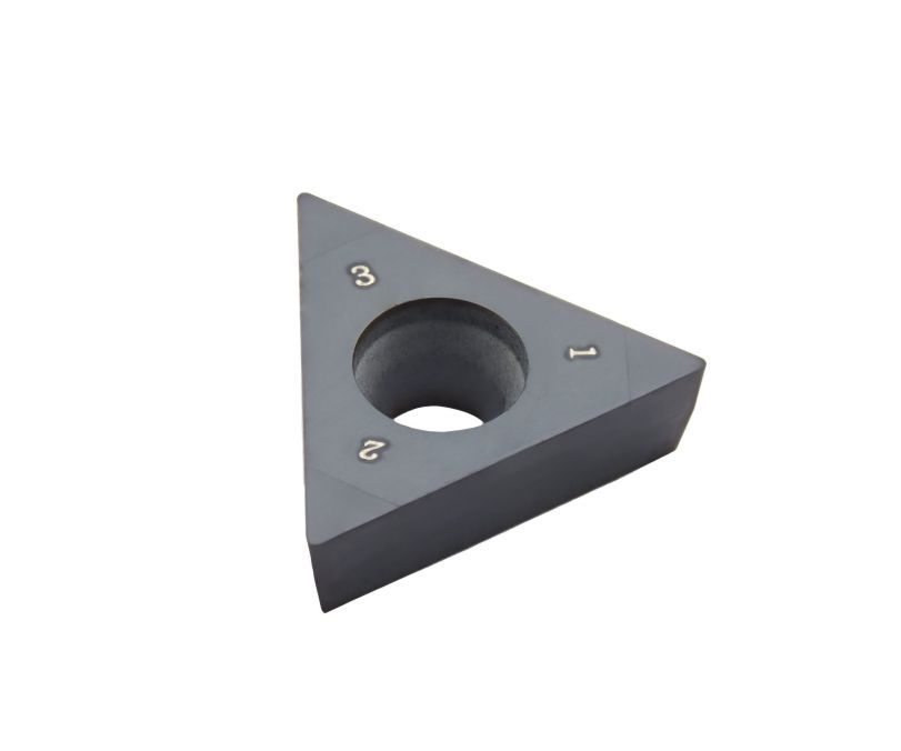 Сменная пластина 3NU-TCGW110302-KBCN700 используется для токарной чистовой обработки закаленной стали. Конструктивно представляет собой основу из твердого сплава, на одной стороне которой установлены три напайки из сверхтвердого материала PCBN с защитным покрытием. Форма пластины - T (треугольник 60°). Позитивная геометрия, задний угол C (7°). Радиус при вершине 0,2 мм.