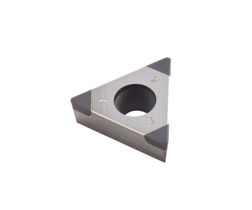 Сменная пластина 3NU-TCGW110304-KBN910 используется для токарной получистовой обработки чугуна. Конструктивно представляет собой основу из твердого сплава, на одной стороне которой установлены три напайки из сверхтвердого материала PCBN без защитного покрытия. Форма пластины - T (треугольник 60°). Позитивная геометрия, задний угол C (7°). Радиус при вершине 0,4 мм.