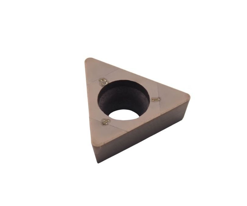 Сменная пластина 3NU-TPGW080204-KBCN800 используется для токарной получистовой обработки чугуна. Конструктивно представляет собой основу из твердого сплава, на одной стороне которой установлены три напайки из сверхтвердого материала PCBN с защитным покрытием. Форма пластины - T (треугольник 60°). Позитивная геометрия, задний угол P (11°). Радиус при вершине 0,4 мм.
