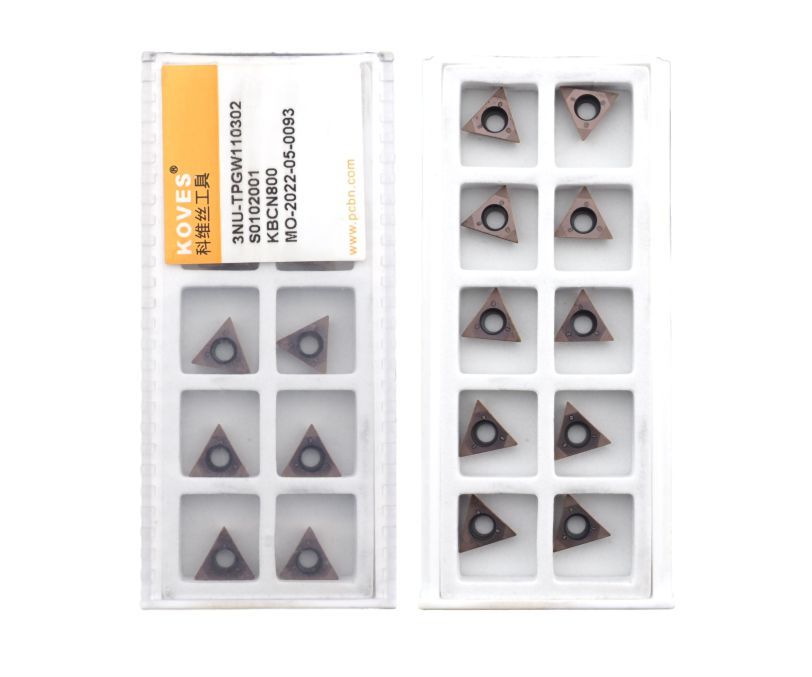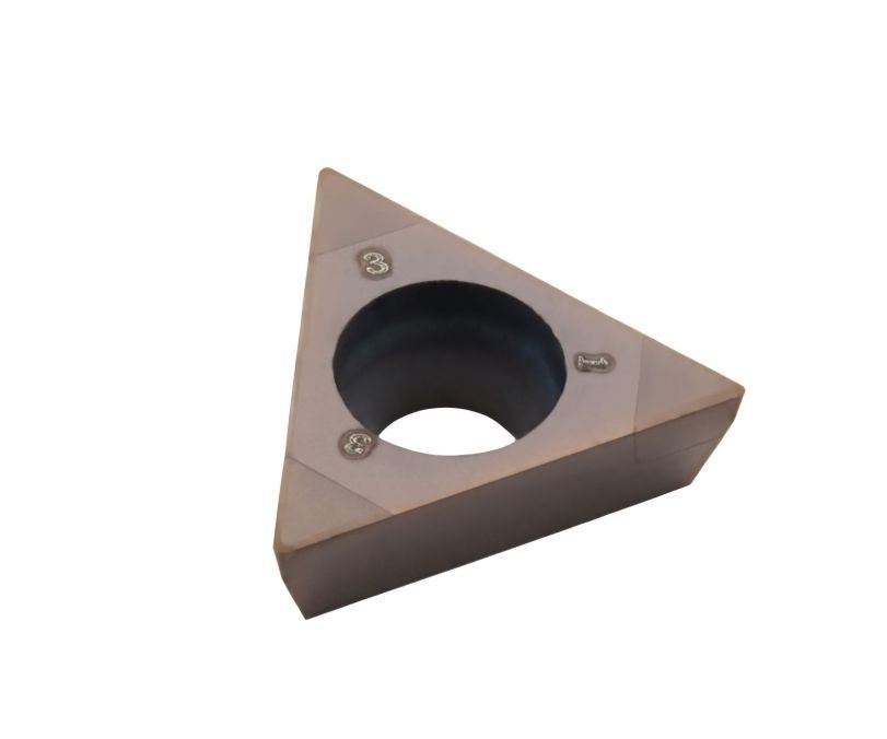 Сменная пластина 3NU-TPGW110302-KBCN800 используется для токарной чистовой обработки чугуна. Конструктивно представляет собой основу из твердого сплава, на одной стороне которой установлены три напайки из сверхтвердого материала PCBN с защитным покрытием. Форма пластины - T (треугольник 60°). Позитивная геометрия, задний угол P (11°). Радиус при вершине 0,2 мм.