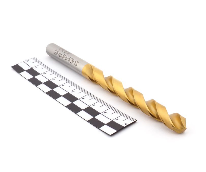 Спиральное сверло по металлу диаметром 9,5 мм, угол при вершине режущей кромки 135°, общая длина сверла 125 мм, длина режущейчасти 81 мм. Сверло изготовлено из быстрорежущей стали SUS HSS-EX (содержание Кобальта 6%) и предназначено для сверления отверстий в изделиях из нержавеющих и жаропрочных сталей. Для увеличения износостойкости сверла применено покрытие из Нитрида Титана (TiN).