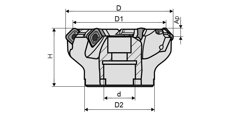 Фреза торцевая насадная с главным углом в плане 45° типа AF01. Рабочий диаметр D 250 мм, посадочный диаметр d 60 мм. Максимальная глубина фрезерования 6,0 мм. Количество зубьев: 14.