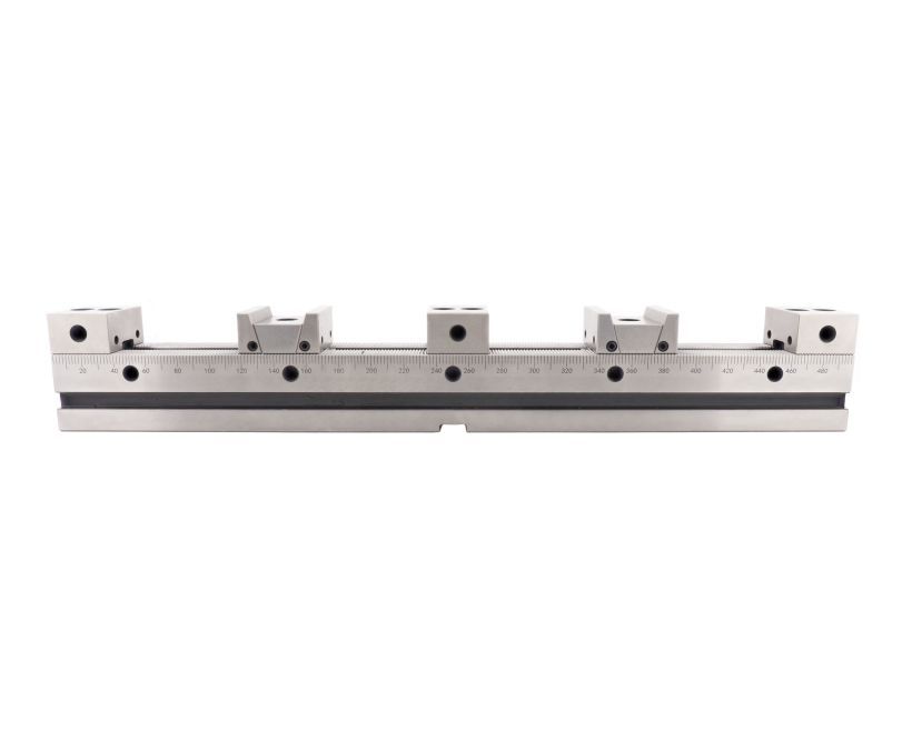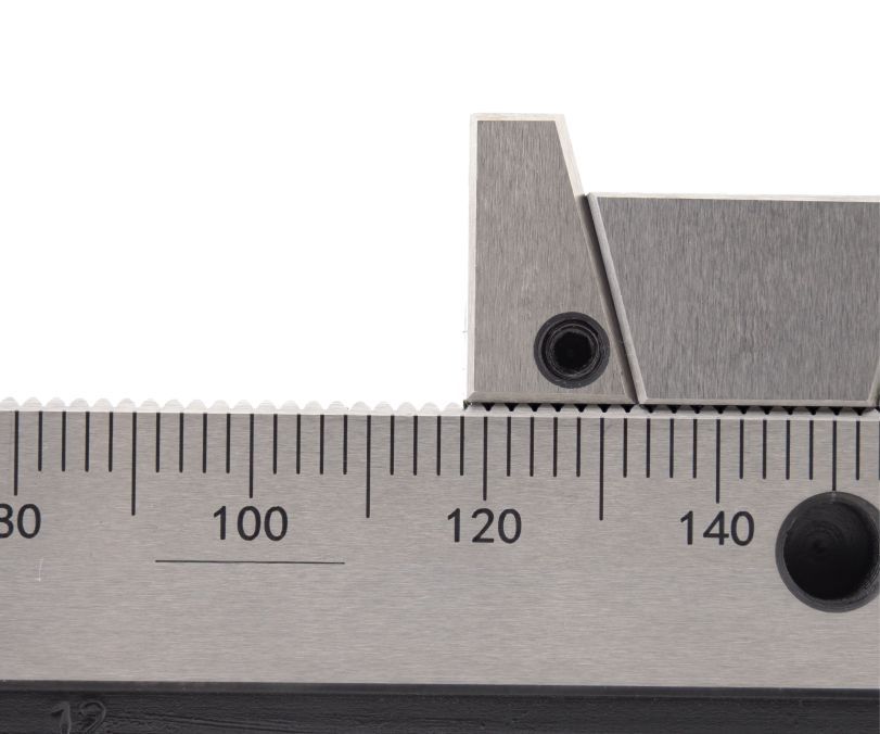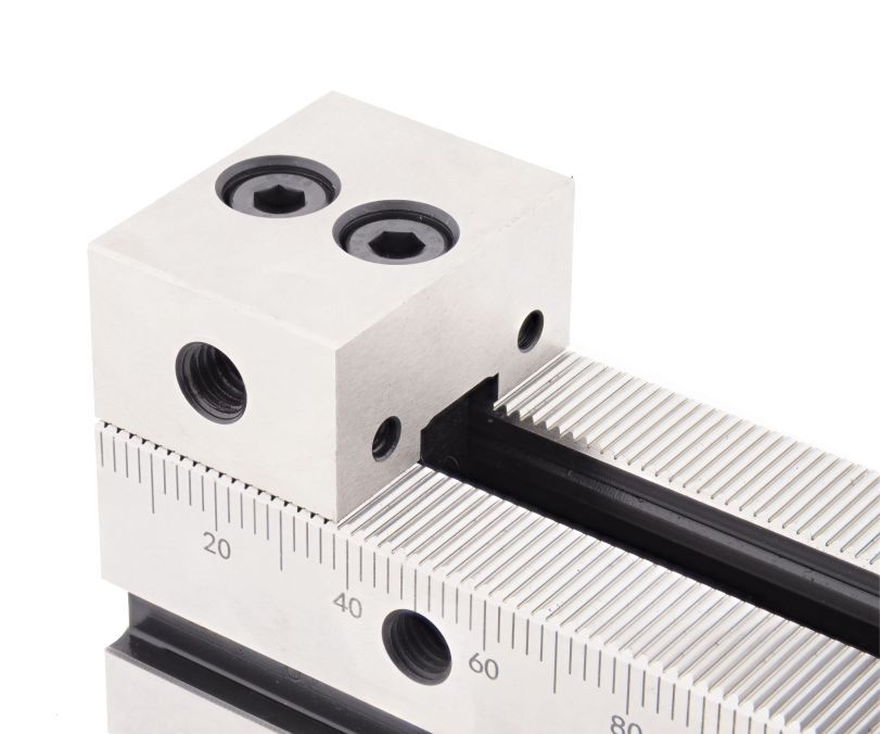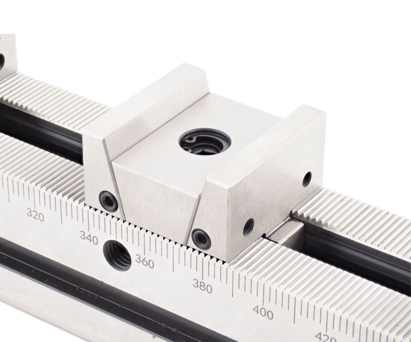 Верхняя поверхность опорной рейки выполнена в форме рельефной гребёнки, что предотвращает возможное смещение упорных губок во время работы. Это гарантирует стабильную фиксацию заготовки независимо от её положения относительно оси зажима. Для монтажа тисков на станок предусмотрены различные варианты крепления – набор прижимов или использование специализированных отверстий. Кроме того, на боковой стороне рейки имеется удобная измерительная шкала с делениями в 2 мм, облегчающая позиционирование элементов.