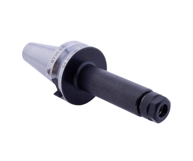 Фрезерный патрон BT30-ER11-100 (MAS 403, JIS B 6339) обеспечивает надежную фиксацию режущего инструмента с цилиндрическим хвостовиком в шпинделе станка и используется в сверлильных, фрезерных станках с ЧПУ, обрабатывающих центрах. Фиксация инструмента в корпусе патрона осуществляется при помощи зажимной цанги ER11 (DIN 6499) и гайки типа А. В зависимости от размера отверстия цанги в патрон устанавливается инструмент с хвостовиком диаметром от 1 до 7 мм. Крепление оправки в шпинделе производится при помощи штревельного болта M12, который не входит в комплект поставки и приобретается дополнительно. Тип подачи СОЖ: АD (через центральное отверстие). Вылет патрона от шпинделя станка составляет 100 мм.