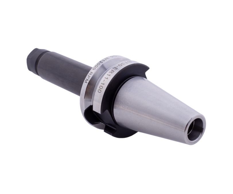 Фрезерный патрон BT30-ER11-150 (MAS 403, JIS B 6339) обеспечивает надежную фиксацию режущего инструмента с цилиндрическим хвостовиком в шпинделе станка и используется в сверлильных, фрезерных станках с ЧПУ, обрабатывающих центрах. Фиксация инструмента в корпусе патрона осуществляется при помощи зажимной цанги ER11 (DIN 6499) и гайки типа А. В зависимости от размера отверстия цанги в патрон устанавливается инструмент с хвостовиком диаметром от 1 до 7 мм. Крепление оправки в шпинделе производится при помощи штревельного болта M12, который не входит в комплект поставки и приобретается дополнительно. Тип подачи СОЖ: АD (через центральное отверстие). Вылет патрона от шпинделя станка составляет 150 мм.