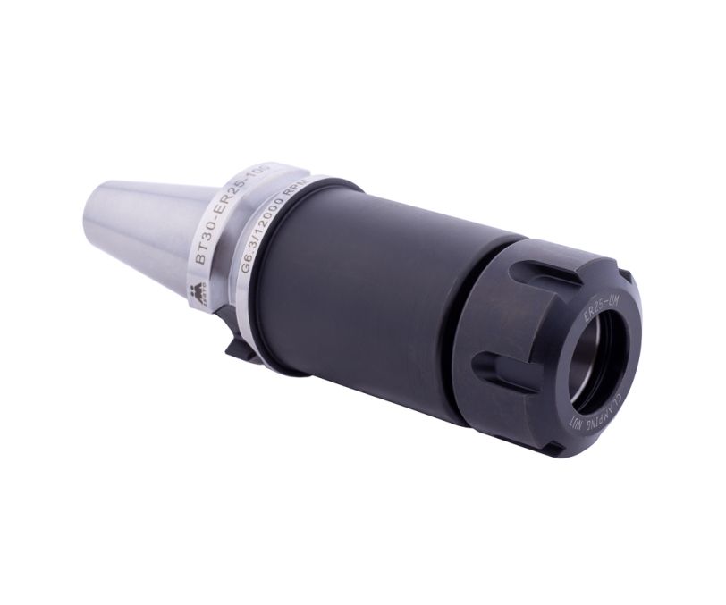 Фрезерный патрон BT30-ER25-100 (MAS 403, JIS B 6339) обеспечивает надежную фиксацию режущего инструмента с цилиндрическим хвостовиком в шпинделе станка и используется в сверлильных, фрезерных станках с ЧПУ, обрабатывающих центрах. Фиксация инструмента в корпусе патрона осуществляется при помощи зажимной цанги ER25 (DIN 6499) и гайки типа UM. В зависимости от размера отверстия цанги в патрон устанавливается инструмент с хвостовиком диаметром от 1 до 16 мм. Крепление оправки в шпинделе производится при помощи штревельного болта M12, который не входит в комплект поставки и приобретается дополнительно. Тип подачи СОЖ: АD (через центральное отверстие). Вылет патрона от шпинделя станка составляет 100 мм.