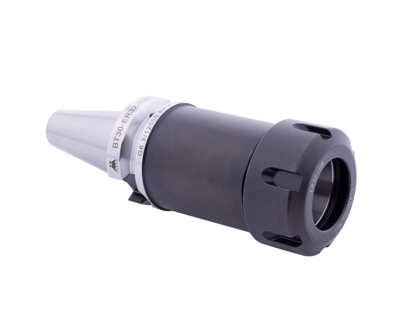 Фрезерный патрон BT30-ER32-150 (MAS 403, JIS B 6339) обеспечивает надежную фиксацию режущего инструмента с цилиндрическим хвостовиком в шпинделе станка и используется в сверлильных, фрезерных станках с ЧПУ, обрабатывающих центрах. Фиксация инструмента в корпусе патрона осуществляется при помощи зажимной цанги ER32 (DIN 6499) и гайки типа UM. В зависимости от размера отверстия цанги в патрон устанавливается инструмент с хвостовиком диаметром от 2 до 20 мм. Крепление оправки в шпинделе производится при помощи штревельного болта M12, который не входит в комплект поставки и приобретается дополнительно. Тип подачи СОЖ: АD (через центральное отверстие). Вылет патрона от шпинделя станка составляет 150 мм.