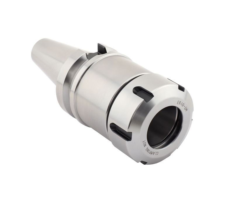 Фиксация инструмента в корпусе патрона осуществляется при помощи зажимной цанги ER40 (DIN 6499) и гайки типа UM. В зависимости от диаметра отверстия цанги, патрон позволяет устанавливать инструмент с хвостовиком диаметром от 3 до 26 мм.