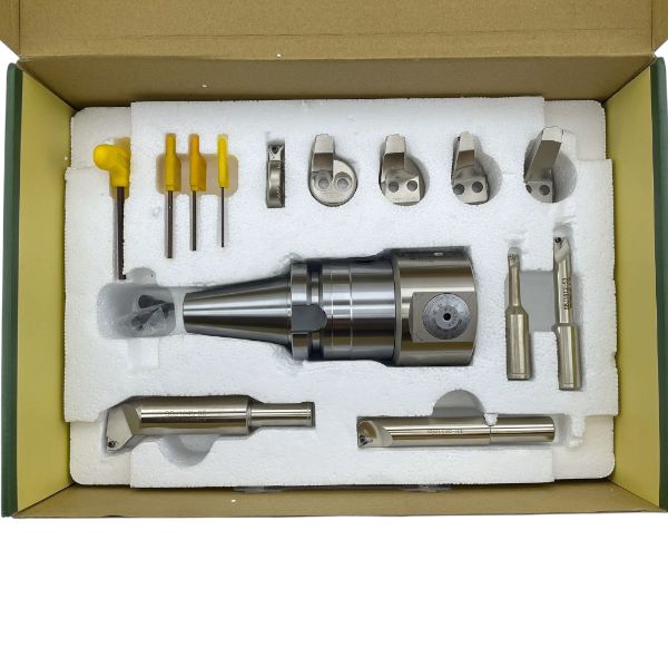 Расточная система BT40-NBH2084S (набор) предназначена для чистового растачивания отверстий диаметром 8-203 мм, применяется на станках фрезерной, сверлильной и расточной группы (включая оборудование с ЧПУ). Набор состоит из фрезерного патрона с хвостовиком BT40, расточной головки NBH2084S, расточных державок и комплекта ключей. Державки надежно фиксируются в корпусе расточной головки при помощи шестигранного болта. Микрометрическая расточная головка NBH2084S снабжена регулировочным винтом со шкалой и позволяет перемещать режущий инструмент с шагом 0,005 мм, максимально точно (до 0.005-0.008 мм) устанавливать необходимый диаметр растачивания. Твердосплавные пластины, а также штревельный болт в комплект поставки не входят и приобретаются дополнительно.
