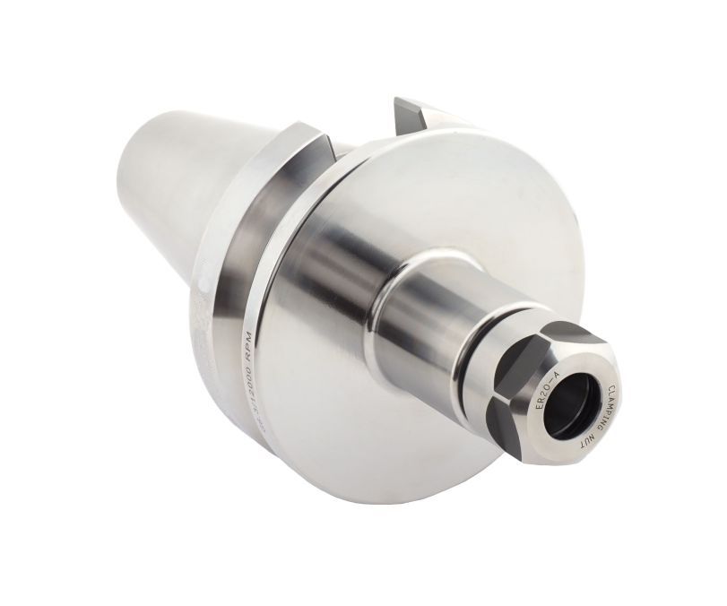 Фрезерный патрон BT50-ER20-150 (MAS 403, JIS B 6339) обеспечивает надежную фиксацию режущего инструмента с цилиндрическим хвостовиком в шпинделе станка и используется в сверлильных, фрезерных станках с ЧПУ, обрабатывающих центрах. Фиксация инструмента в корпусе патрона осуществляется при помощи зажимной цанги ER20 (DIN 6499) и гайки типа A. В зависимости от размера отверстия цанги в патрон устанавливается инструмент с хвостовиком диаметром от 1 до 13 мм. Крепление оправки в шпинделе производится при помощи штревельного болта M24, который не входит в комплект поставки и приобретается дополнительно. Тип подачи СОЖ: АD (через центральное отверстие). Вылет патрона от шпинделя станка составляет 150 мм.