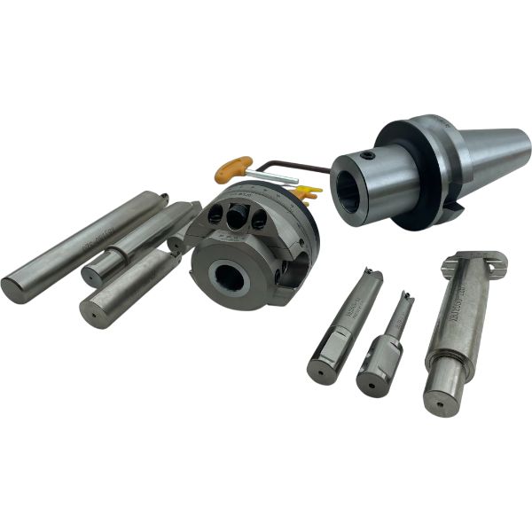 Расточная система BT50-NBH2084X (набор) предназначена для чистового растачивания отверстий диаметром 8-320 мм, применяется на станках фрезерной, сверлильной и расточной группы (включая оборудование с ЧПУ). Набор состоит из фрезерного патрона с хвостовиком BT50, расточной головки NBH2084X, расточных державок и комплекта ключей. Державки надежно фиксируются в корпусе расточной головки при помощи шестигранного болта. Микрометрическая расточная головка NBH2084X снабжена регулировочным винтом со шкалой и позволяет перемещать режущий инструмент с шагом 0,005 мм, максимально точно (до 0.005-0.008 мм) устанавливать необходимый диаметр растачивания. Твердосплавные пластины, а также штревельный болт в комплект поставки не входят и приобретаются дополнительно.
