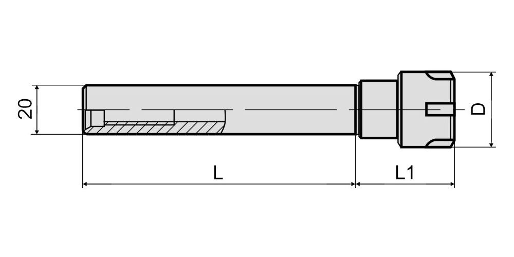 Фрезерный патрон C20-ER20M-100 (DIN 6535 HA / ISO 3338) используется в условиях большого вылета инструмента или ограниченного доступа к зоне резания. Цилиндрический хвостовик оправки фиксируется в цанговом зажиме большего размера или патроне Weldon (при наличии специальной лыски на хвостовике). Установка режущего инструмента в корпус патрона осуществляется при помощи зажимной цанги ER20 (DIN 6499) и гайки типа M. В зависимости от размера отверстия цанги в патрон устанавливается инструмент с цилиндрическим хвостовиком диаметром от 1 до 13 мм. Длина хвостовика патрона составляет 100 мм.