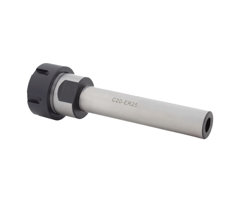 Фрезерный патрон C20-ER25-150 (DIN 6535 HA / ISO 3338) используется в условиях большого вылета инструмента или ограниченного доступа к зоне резания. Цилиндрический хвостовик оправки фиксируется в цанговом зажиме большего размера или патроне Weldon (при наличии специальной лыски на хвостовике). Установка режущего инструмента в корпус патрона осуществляется при помощи зажимной цанги ER25 (DIN 6499) и гайки типа A. В зависимости от размера отверстия цанги в патрон устанавливается инструмент с цилиндрическим хвостовиком диаметром от 1 до 16 мм. Длина хвостовика патрона составляет 150 мм.