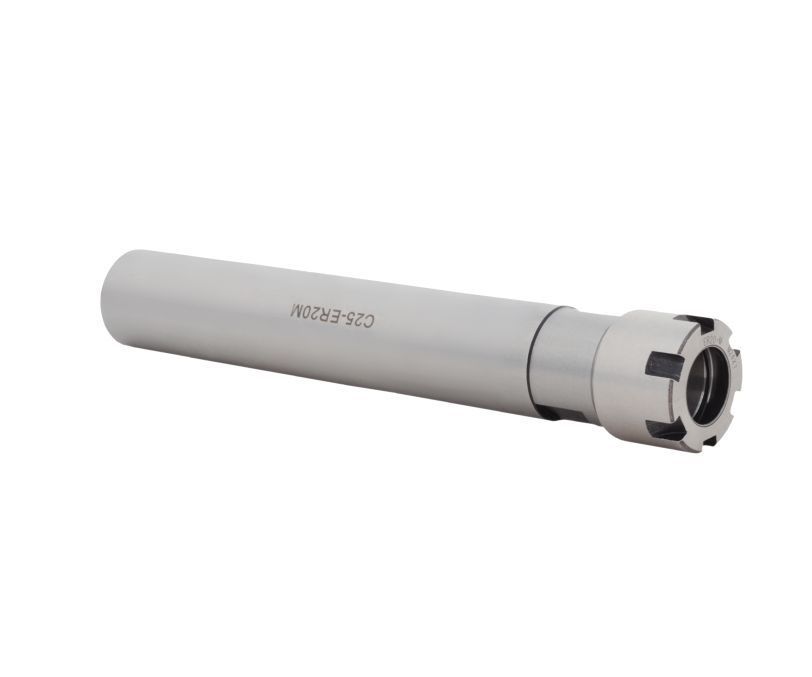 Фрезерный патрон C25-ER20M-080 (DIN 6535 HA / ISO 3338) используется в условиях большого вылета инструмента или ограниченного доступа к зоне резания. Цилиндрический хвостовик оправки фиксируется в цанговом зажиме большего размера или патроне Weldon (при наличии специальной лыски на хвостовике). Установка режущего инструмента в корпус патрона осуществляется при помощи зажимной цанги ER20 (DIN 6499) и гайки типа M. В зависимости от размера отверстия цанги в патрон устанавливается инструмент с цилиндрическим хвостовиком диаметром от 1 до 13 мм. Длина хвостовика патрона составляет 80 мм.