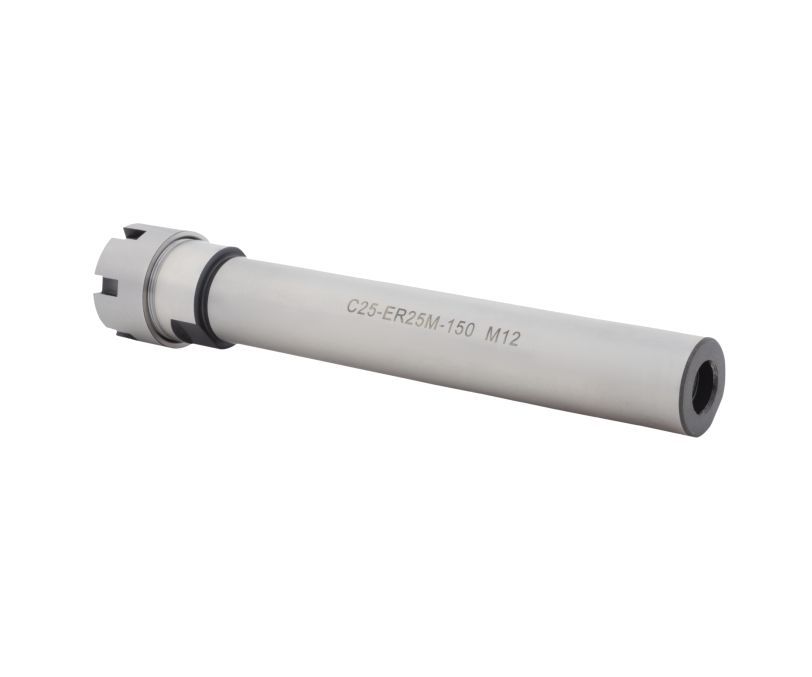 Фрезерный патрон C25-ER25-150 (DIN 6535 HA / ISO 3338) используется в условиях большого вылета инструмента или ограниченного доступа к зоне резания. Цилиндрический хвостовик оправки фиксируется в цанговом зажиме большего размера или патроне Weldon (при наличии специальной лыски на хвостовике). Установка режущего инструмента в корпус патрона осуществляется при помощи зажимной цанги ER25 (DIN 6499) и гайки типа M. В зависимости от размера отверстия цанги в патрон устанавливается инструмент с цилиндрическим хвостовиком диаметром от 1 до 16 мм. Длина хвостовика патрона составляет 150 мм.