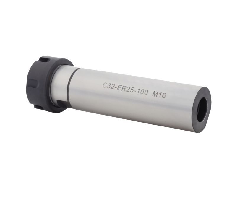 Фрезерный патрон C32-ER25-150 (DIN 6535 HA / ISO 3338) используется в условиях большого вылета инструмента или ограниченного доступа к зоне резания. Цилиндрический хвостовик оправки фиксируется в цанговом зажиме большего размера или патроне Weldon (при наличии специальной лыски на хвостовике). Установка режущего инструмента в корпус патрона осуществляется при помощи зажимной цанги ER25 (DIN 6499) и гайки типа UM. В зависимости от размера отверстия цанги в патрон устанавливается инструмент с цилиндрическим хвостовиком диаметром от 1 до 16 мм. Длина хвостовика патрона составляет 150 мм.