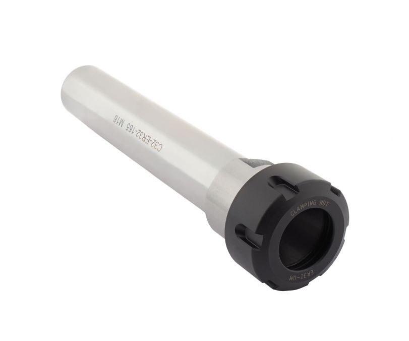 Фрезерный патрон C32-ER32-165 (DIN 6535 HA / ISO 3338) используется в условиях большого вылета инструмента или ограниченного доступа к зоне резания. Цилиндрический хвостовик оправки фиксируется в цанговом зажиме большего размера или патроне Weldon (при наличии специальной лыски на хвостовике). Установка режущего инструмента в корпус патрона осуществляется при помощи зажимной цанги ER32 (DIN 6499) и гайки типа UM. В зависимости от размера отверстия цанги в патрон устанавливается инструмент с цилиндрическим хвостовиком диаметром от 2 до 20 мм. Длина хвостовика патрона составляет 165 мм.
