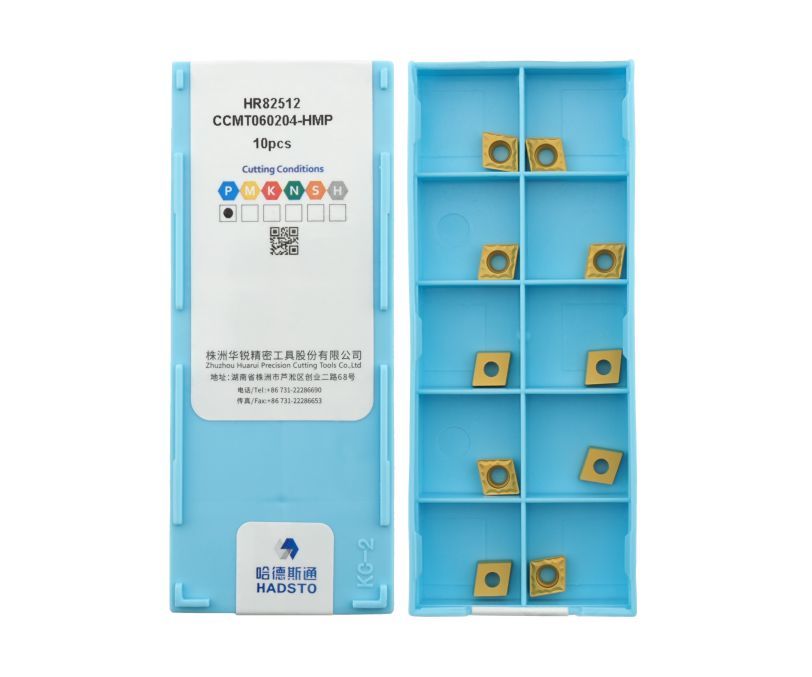 Твердосплавная сменная пластина CCMT060204-HMP-HR82512 бренда HADSTO применяется для получистовой обработки заготовок из стали.