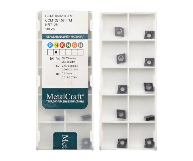 Твердосплавная сменная пластина CCMT060204-TM-HR7125 бренда MetalCraft применяется для получистовой обработки заготовок из нержавеющей стали.