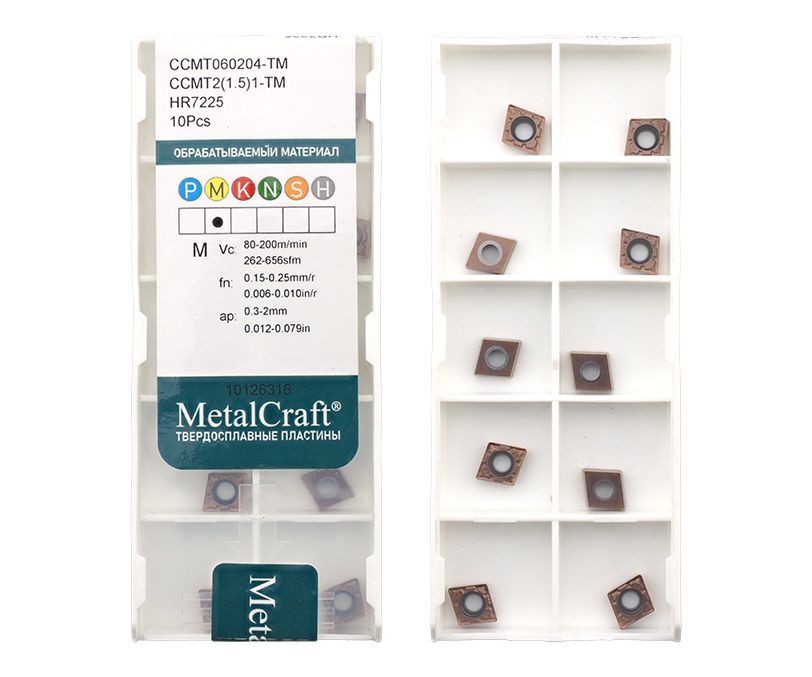 Твердосплавная сменная пластина CCMT060204-TM-HR7225 бренда MetalCraft применяется для получистовой обработки заготовок из нержавеющей стали.