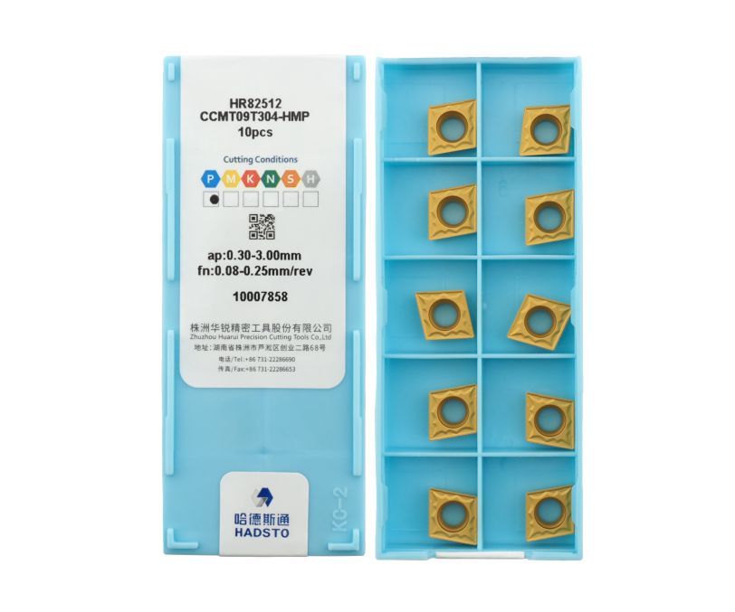 Твердосплавная сменная пластина CCMT09T304-HMP-HR82512 бренда HADSTO применяется для получистовой обработки заготовок из стали.