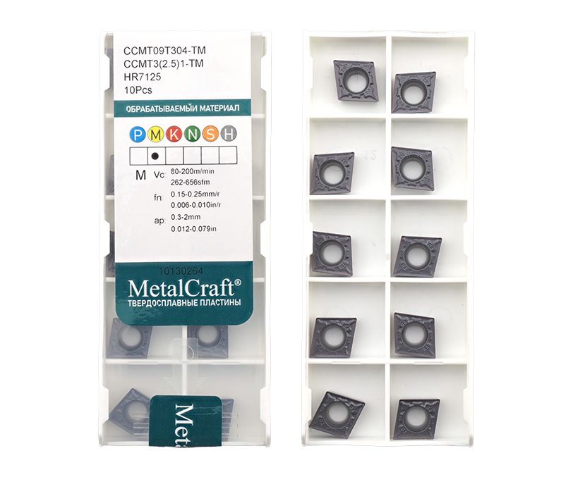 Твердосплавная сменная пластина CCMT09T304-TM-HR7125 бренда MetalCraft применяется для получистовой обработки заготовок из нержавеющей стали.