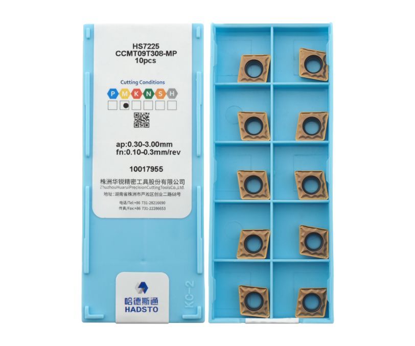 Твердосплавная сменная пластина CCMT09T308-MP-HS7225 бренда HADSTO применяется для чистовой обработки заготовок из нержавеющей стали.