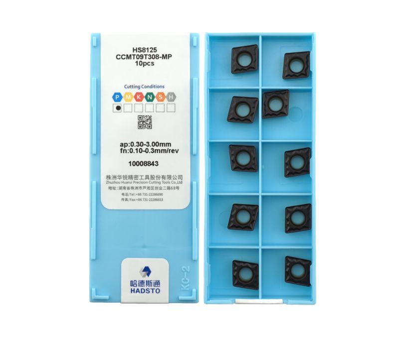 Твердосплавная сменная пластина CCMT09T308-MP-HS8125 бренда HADSTO применяется для чистовой обработки заготовок из стали.