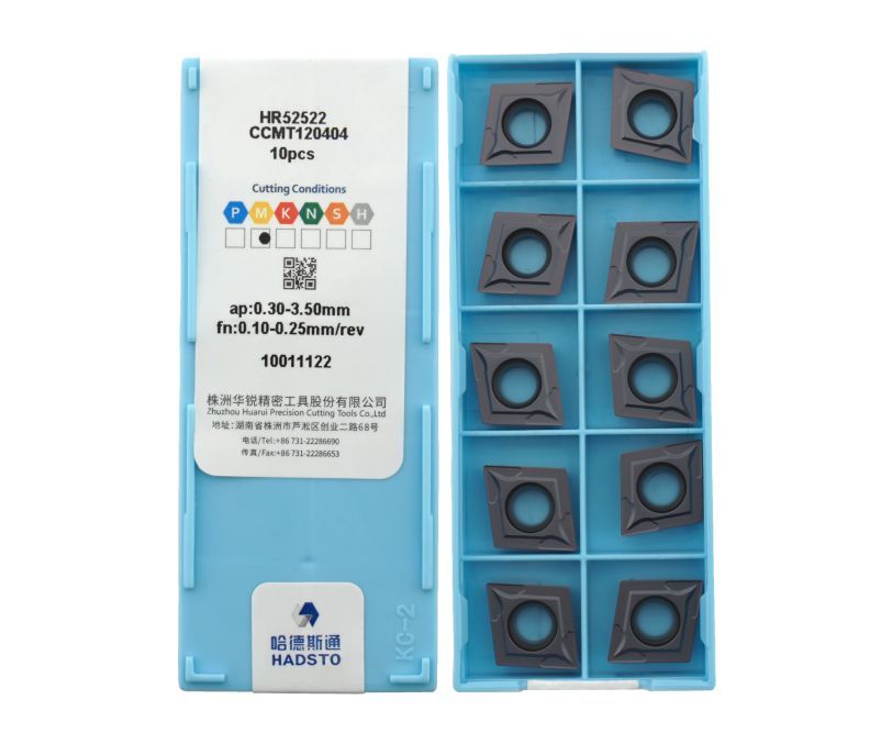 Твердосплавная сменная пластина CCMT120404-HR52522 бренда HADSTO применяется для получистовой обработки заготовок из стали, нержавеющей стали и чугуна.