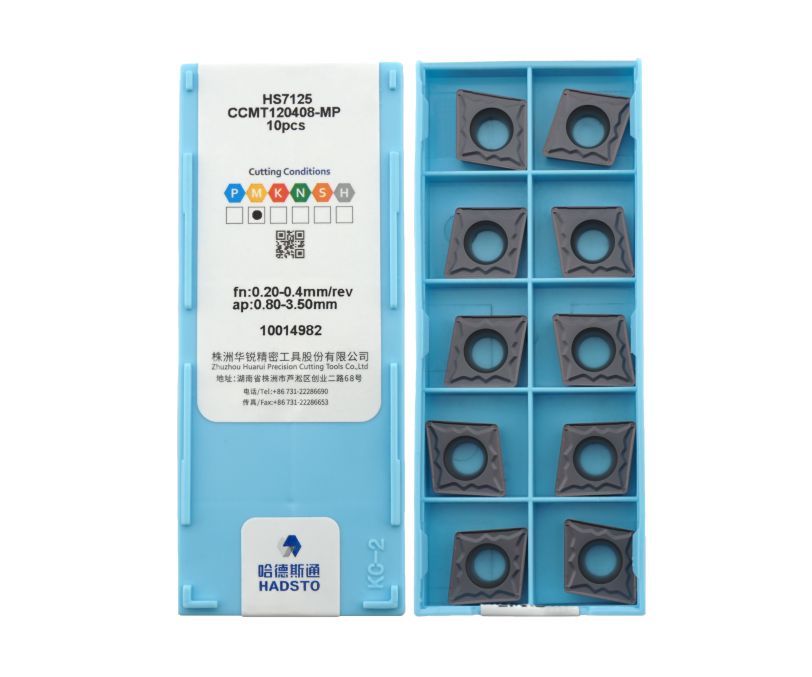 Твердосплавная сменная пластина CCMT120408-MP-HS7125 бренда HADSTO применяется для чистовой обработки заготовок из нержавеющей стали.