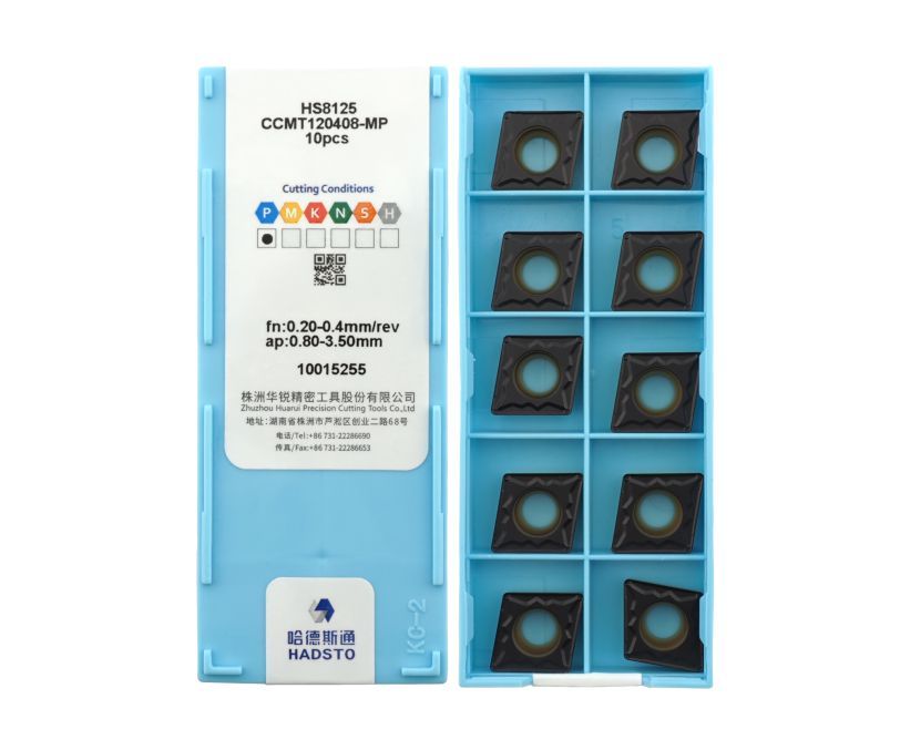 Твердосплавная сменная пластина CCMT120408-MP-HS8125 бренда HADSTO применяется для чистовой обработки заготовок из стали.