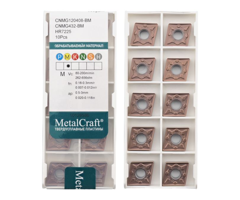 Твердосплавная сменная пластина CNMG120408-BM-HR7225 бренда MetalCraft применяется для получистовой обработки заготовок из нержавеющей стали.