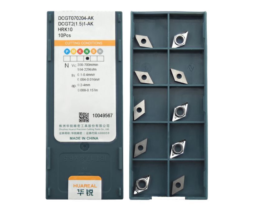 Твердосплавная сменная пластина DCGT070204-AK-HRK10 бренда Huareal применяется для получистовой обработки заготовок из алюминия и сплавов цветных металлов.